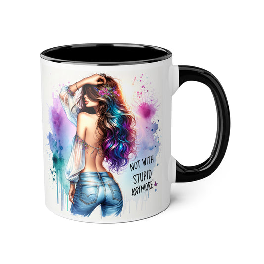Not With Stupid Anymore Humoristic Colorful Stupid Quote Mug, Trendy Coffee Cup, Fun Gift for Her, Unique Art Mug, Perfect for Birthdays, Inspirational Drinkware