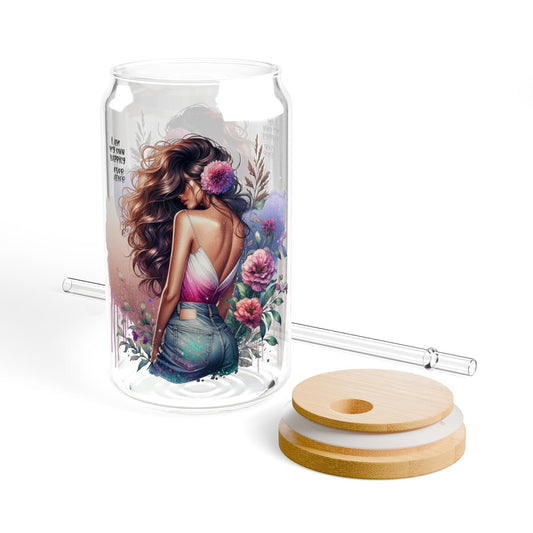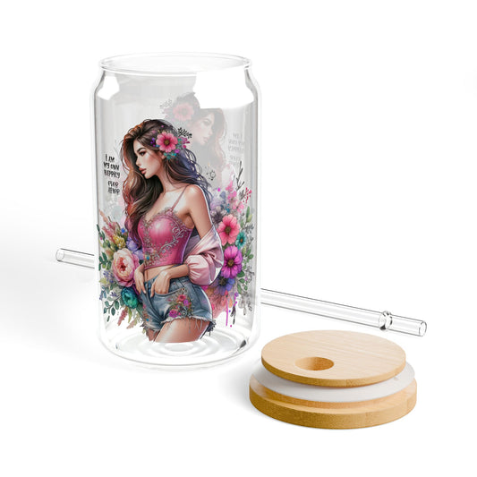 I Am My Own Happily Ever After Artistic Sipper Glass with Straw - 16oz, Personalized Drinkware for Party, Home, Summer, Cute Gift for Her, Floral Design