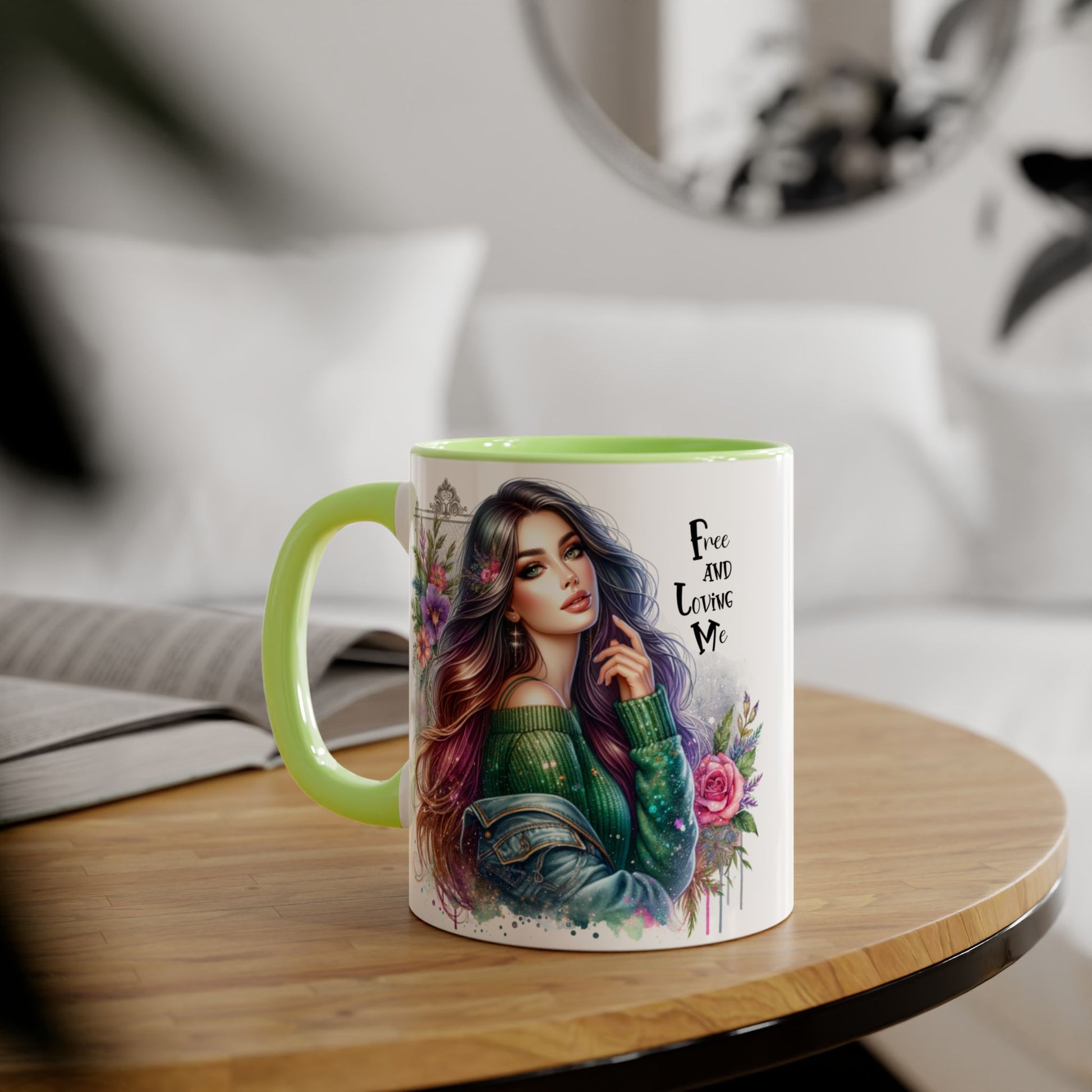 Bohemian Chic Accent Mug, Free and Loving Me 11oz Coffee Cup, Gifts for Her, Artistic Drinkware, Unique Home Decor, Floral Coffee Mug