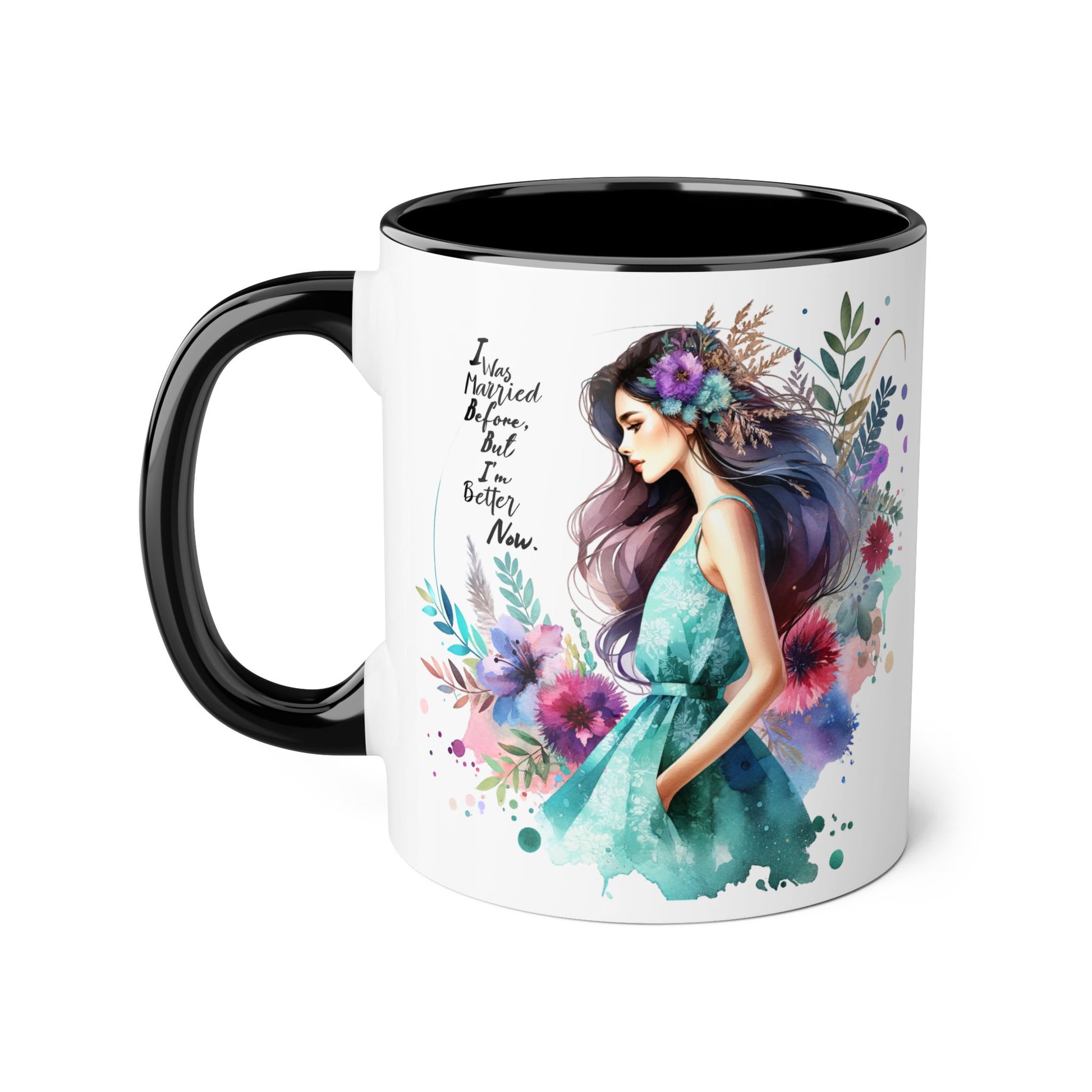 I Was Married Before But I'm Better Now Inspirational Accent Mug, 11oz Coffee Cup, Floral Women’s Art Beverage Container, Motivational Gift, Perfect for Friends & Family