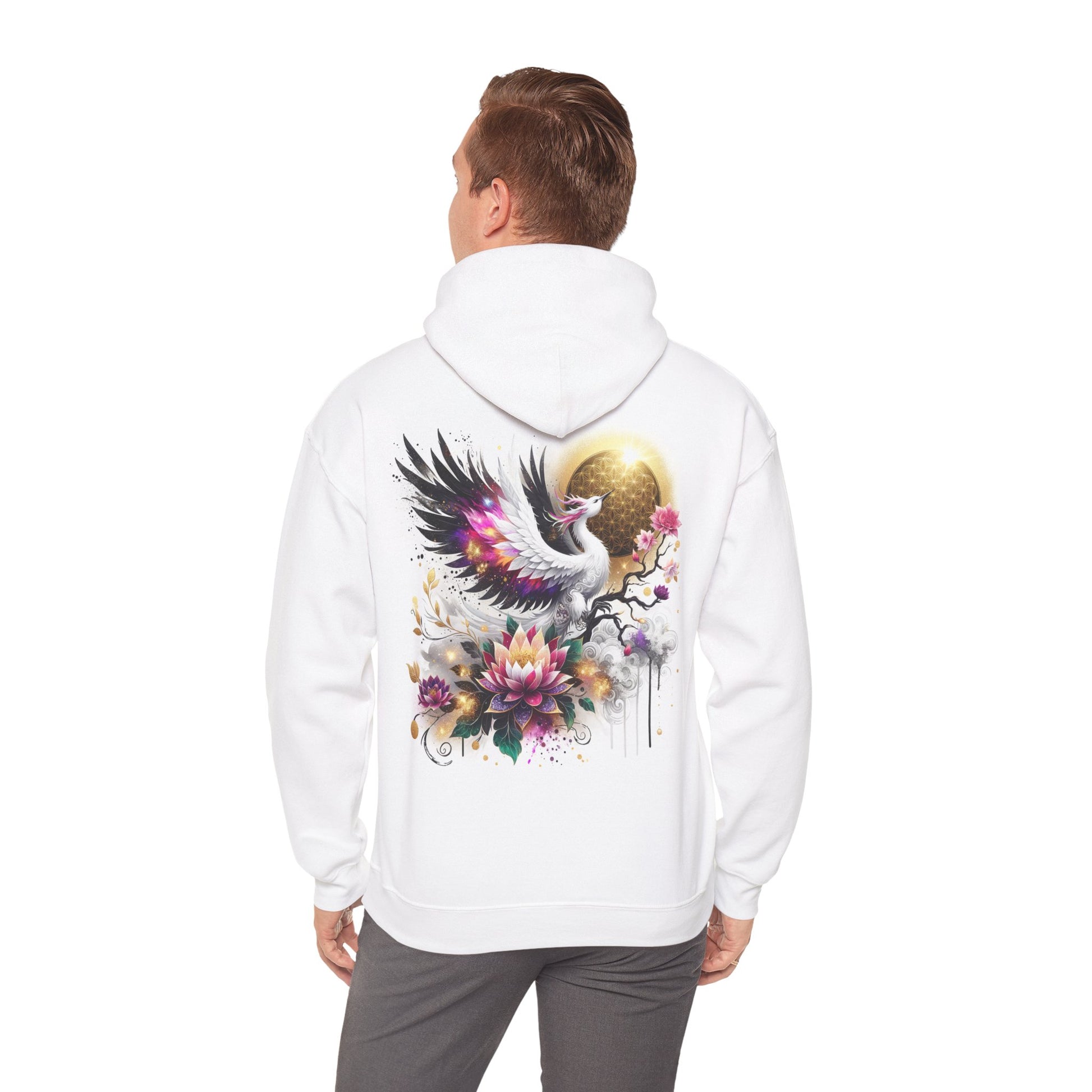 This resilient hoodie features a design of a rising phoenix, symbolizing strength and rebirth. Perfect for those looking for a cozy and stylish piece of clothing to add to their wardrobe. Ideal for adults who appreciate unique designs and want to stay warm during colder seasons. Suitable for casual wear and can be a great gift for birthdays, holidays, or special occasions.