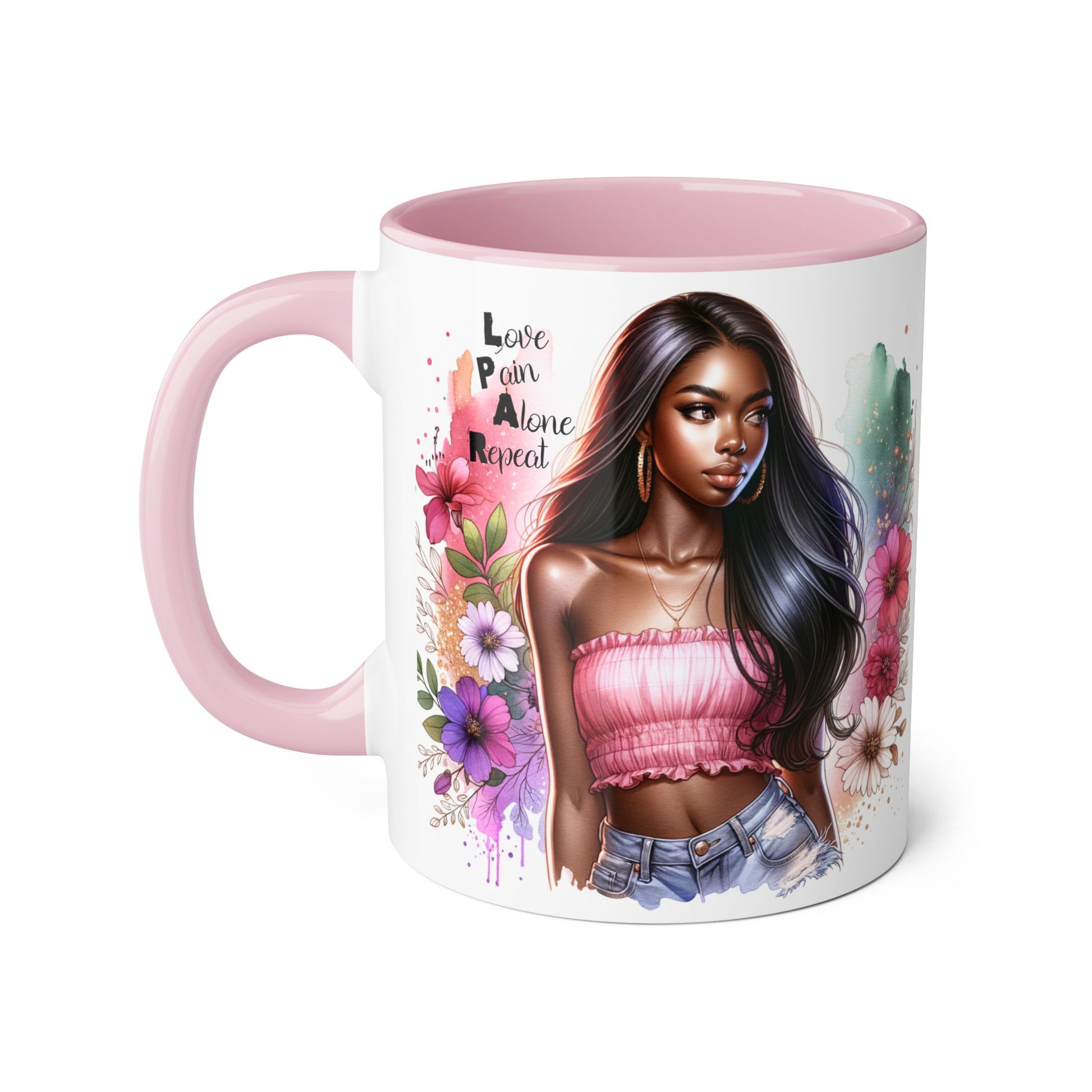 Vibrant Floral Accent Mug - Love, Pain, Alone, Repeat | Perfect Gift for Friends, Birthdays, Affirmation Mug, Coffee Lover